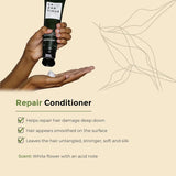 Thanks to its high plant-based keratin content, the Repair Conditioner restores and strengthens damaged and sensitized hair, enhancing softness, flexibility, and shine. Formulated for daily use, it eases detangling and helps prevent breakage. The plant-based hyaluronic acid in the formula plumps and fortifies the hair fiber. The Repair Conditioner acts as a balm, enveloping each strand. Rinse off.